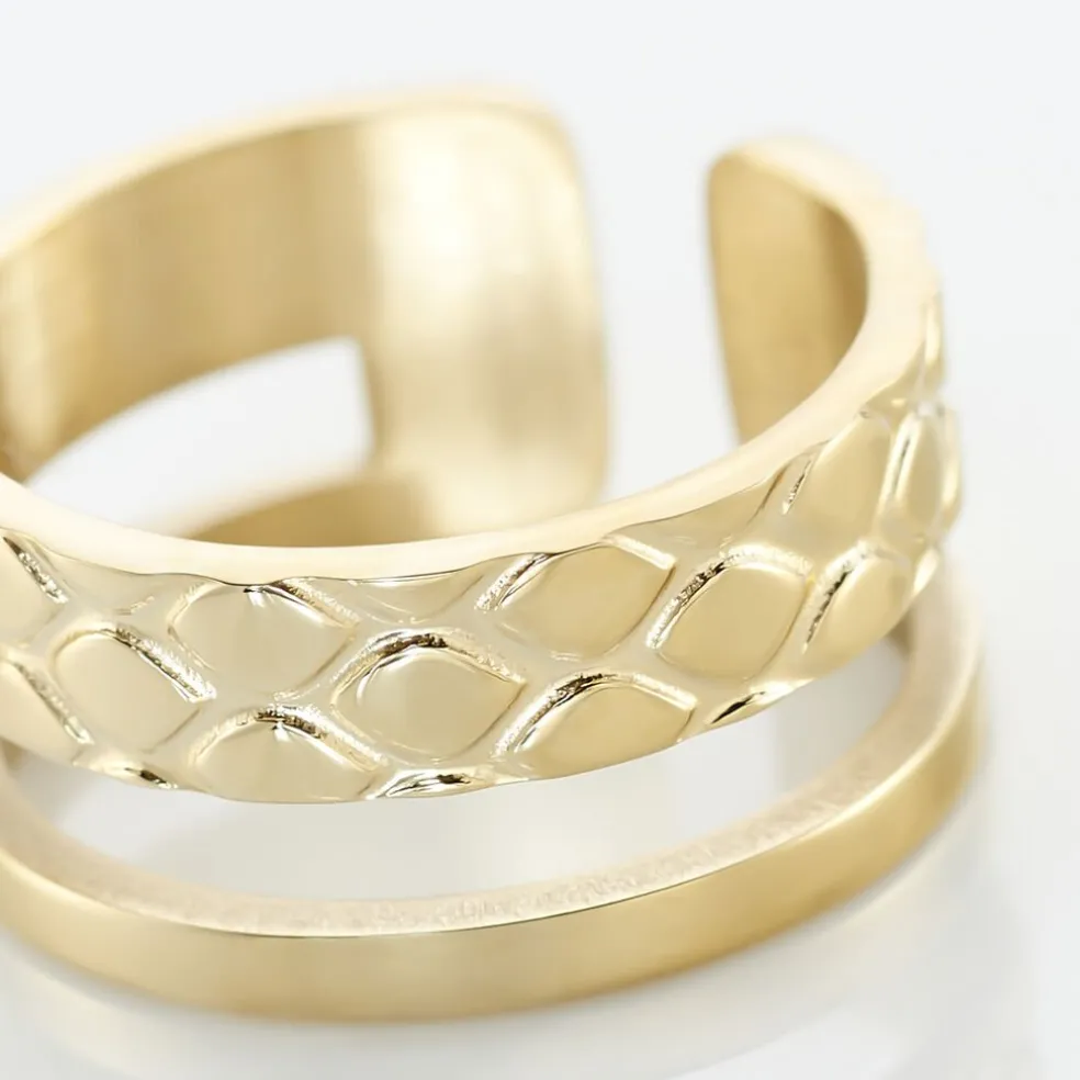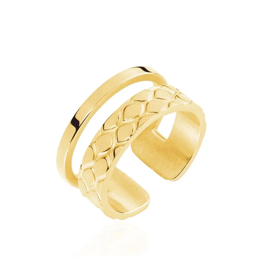 Bague Ajustable Acier Dore 2 Anneaux Larges Ajoures Lisse Et Reptile
