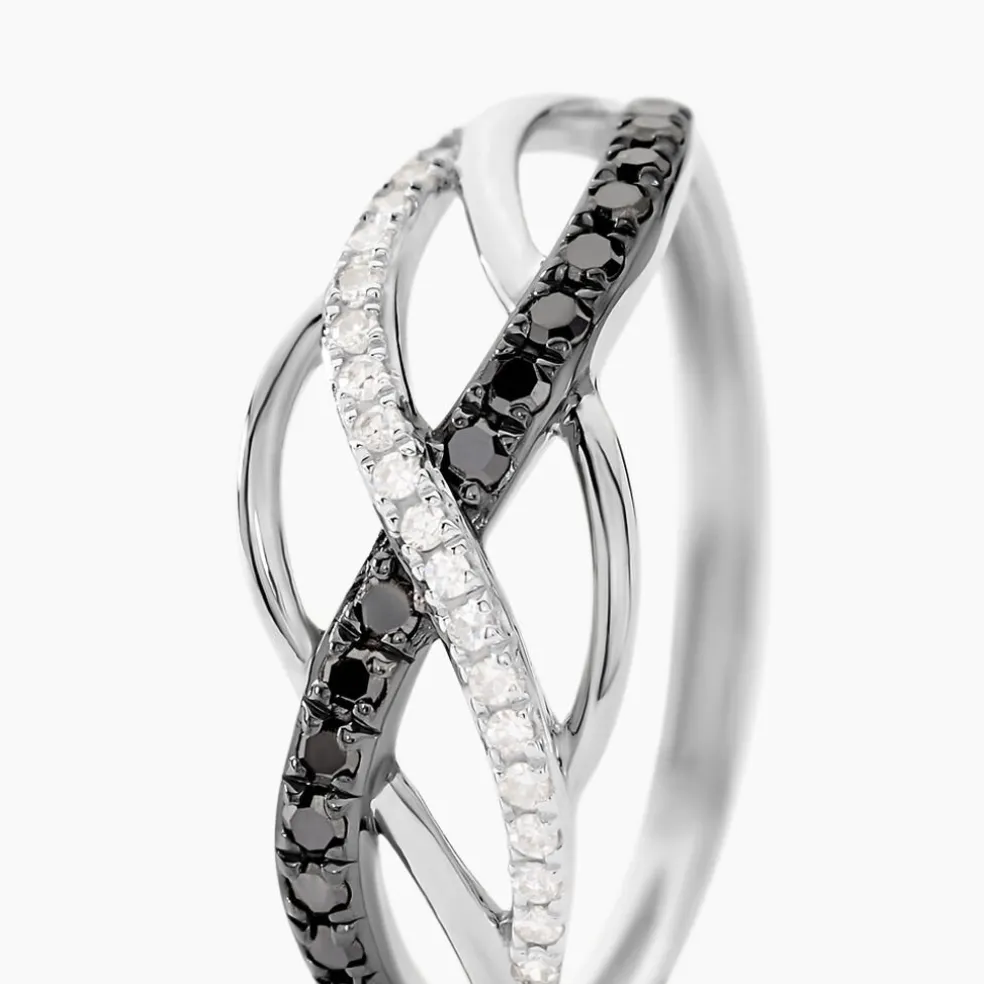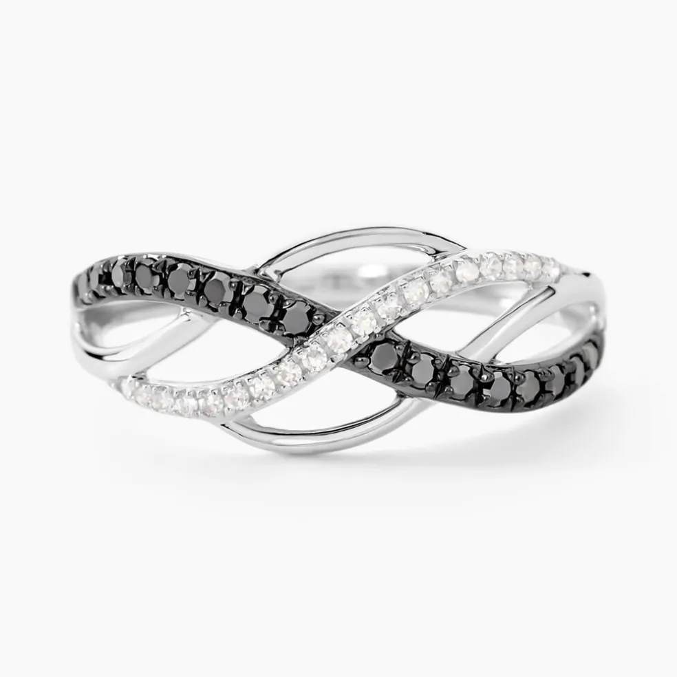 Bague Or Blanc 375/1000 Vagues Croisées Diamants Blancs Et Noirs