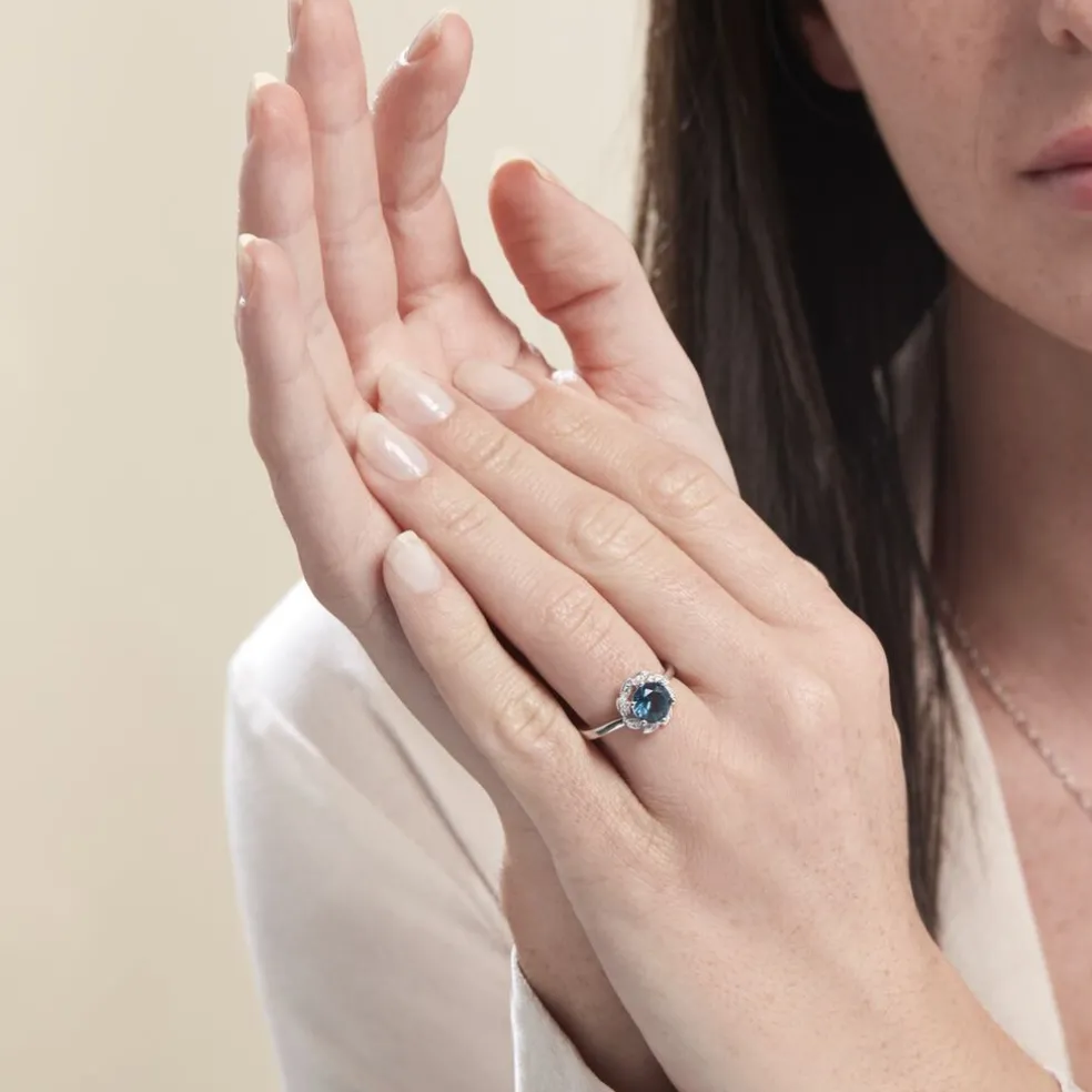 Bague Argent Blanc 925/1000 Fleur En Verre Bleu Serti 6 Griffes Et Oxydes De Zirconium