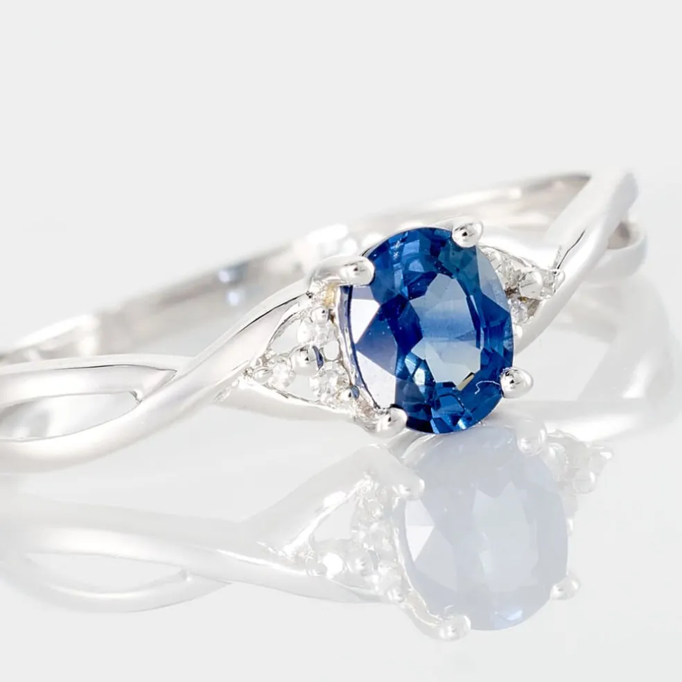 Bague Or Blanc 375/1000 Saphir Central Serti 4 Griffes Corps De Bague Entrelace Diamants