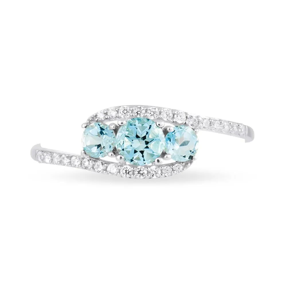 Bague Or Blanc 375/1000 Trilogie Topazes Bleus 0.57ct Sertis 4 Griffes Et Oxydes De Zirconium
