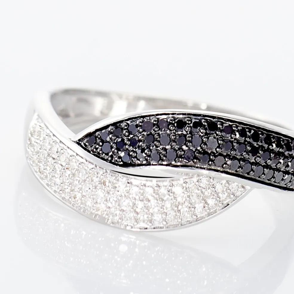 Bague Or Blanc 375/1000 Forme Croisée Diamants Noirs Et Diamants Blancs