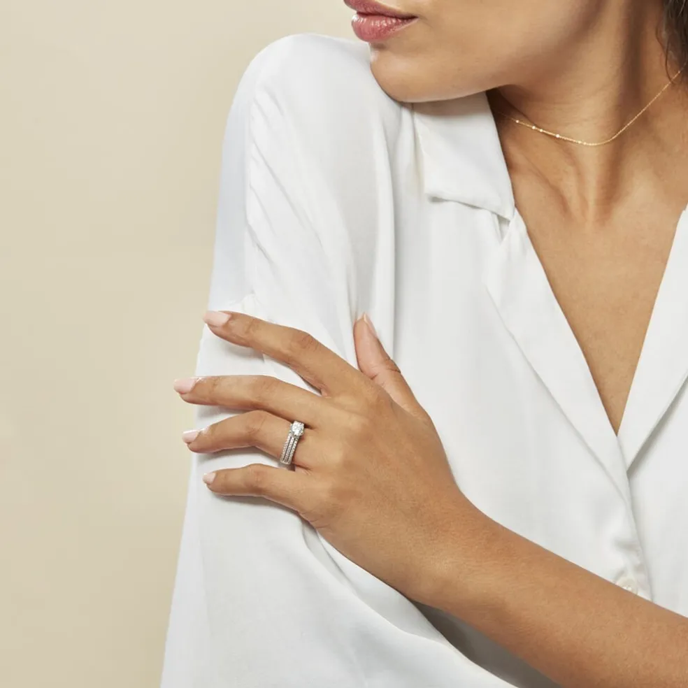 Bague Solitaire Argent Blanc 925/1000 6 Griffes Corps De Bague 3 Rangs Pavage Oxydes De Zirconium