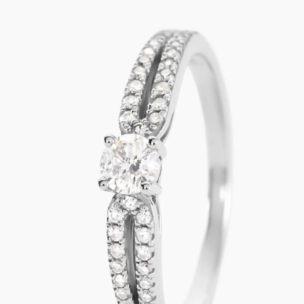 Solitaire Or Blanc 750/1000 Diamant Central 0.15cts Corps De Bague Double Accompagne Diamants