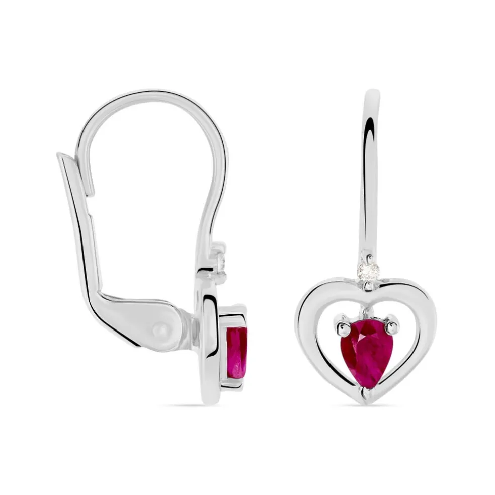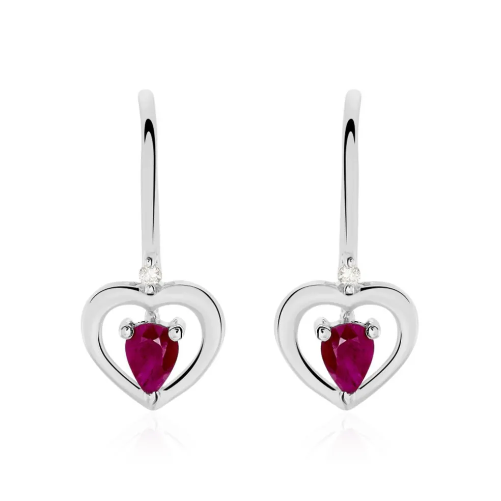 Boucles D’oreilles Pendantes Or Blanc 375/1000 Dormeuses Formes C艙urs Rubis 0.44cts