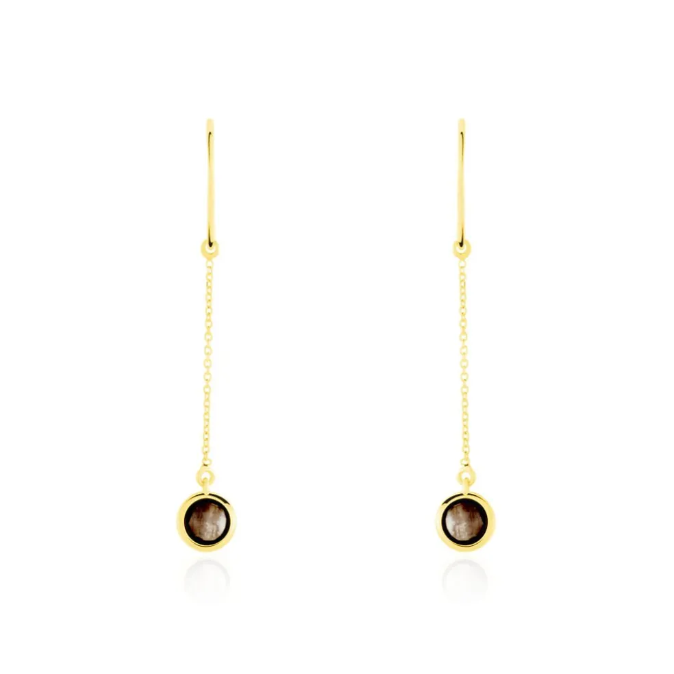 Boucles D’oreilles Or Jaune 375/1000 Pendantes Quartz Fumes Sertis Clos