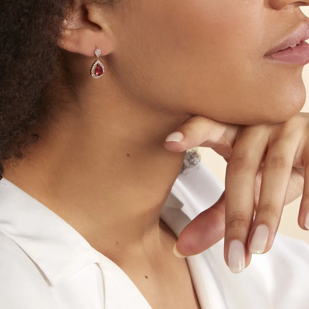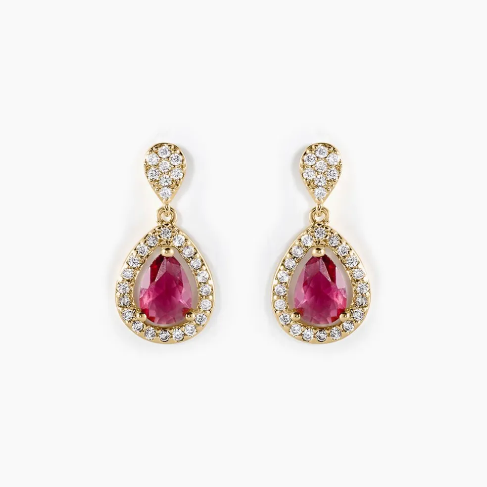 Boucles D’oreilles Plaqué Or Jaune Pierres Rouges Entourages Oxydes De Zirconium