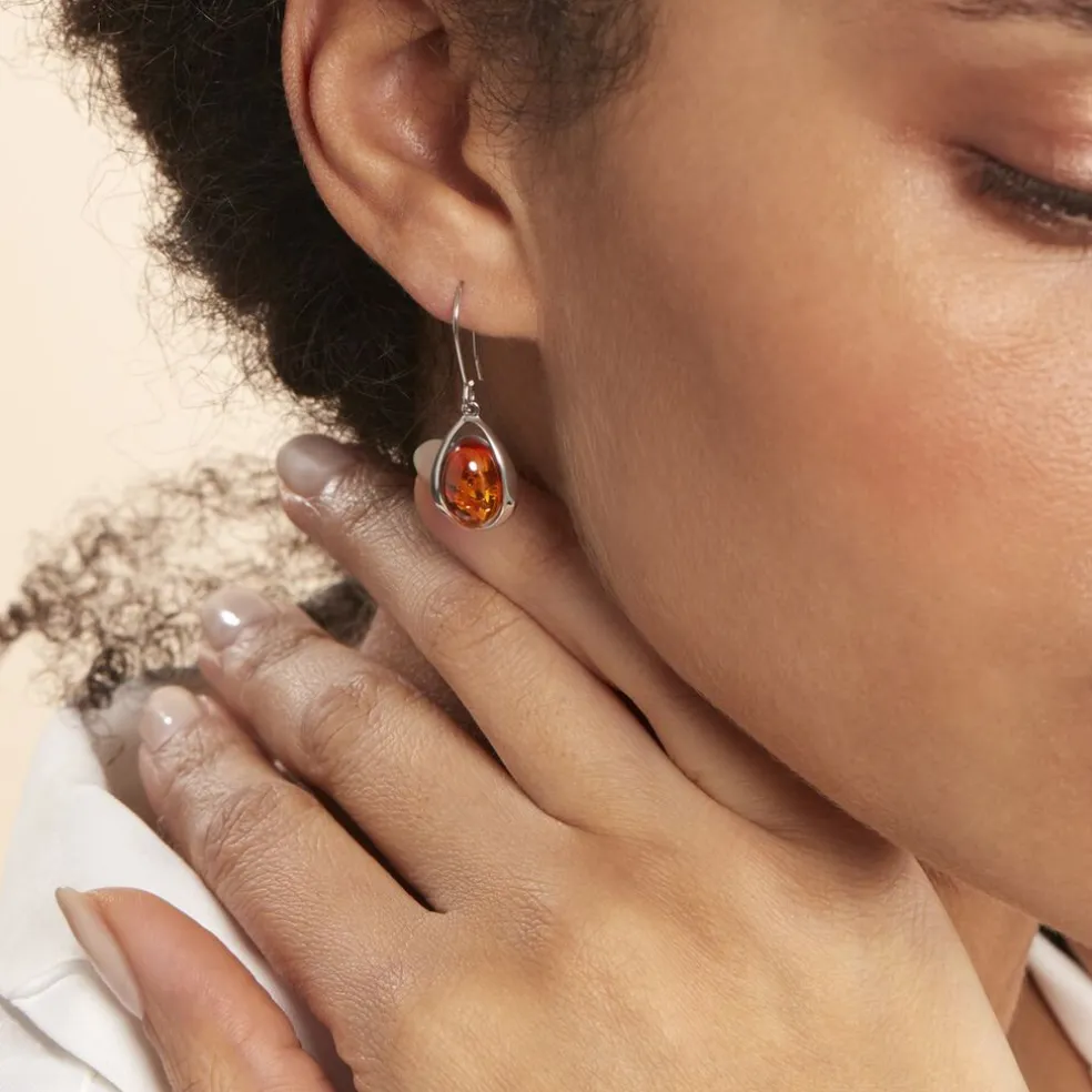 Boucles D’oreilles Argent Blanc 925/1000 Formes Gouttes Ambre Cognac