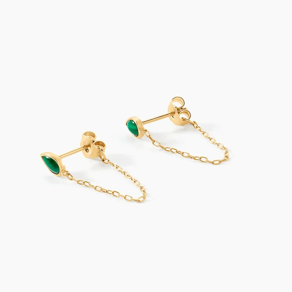 Boucles D’Oreilles Pendantes Or Jaune 375/1000 Gouttes Malachite Verte Avec Chaine Forcat
