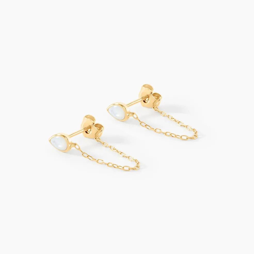Boucles D’Oreilles Pendantes Or Jaune 375/1000 Gouttes Nacre Blanche Avec Chaine Forcat