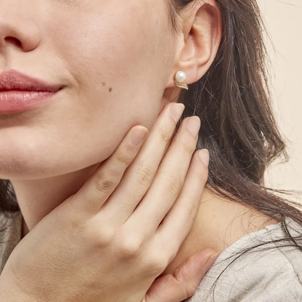 Boucles D’oreilles Or Jaune 375/1000 Perle De Culture Nacre 6mm Et Oxydes De Zirconium