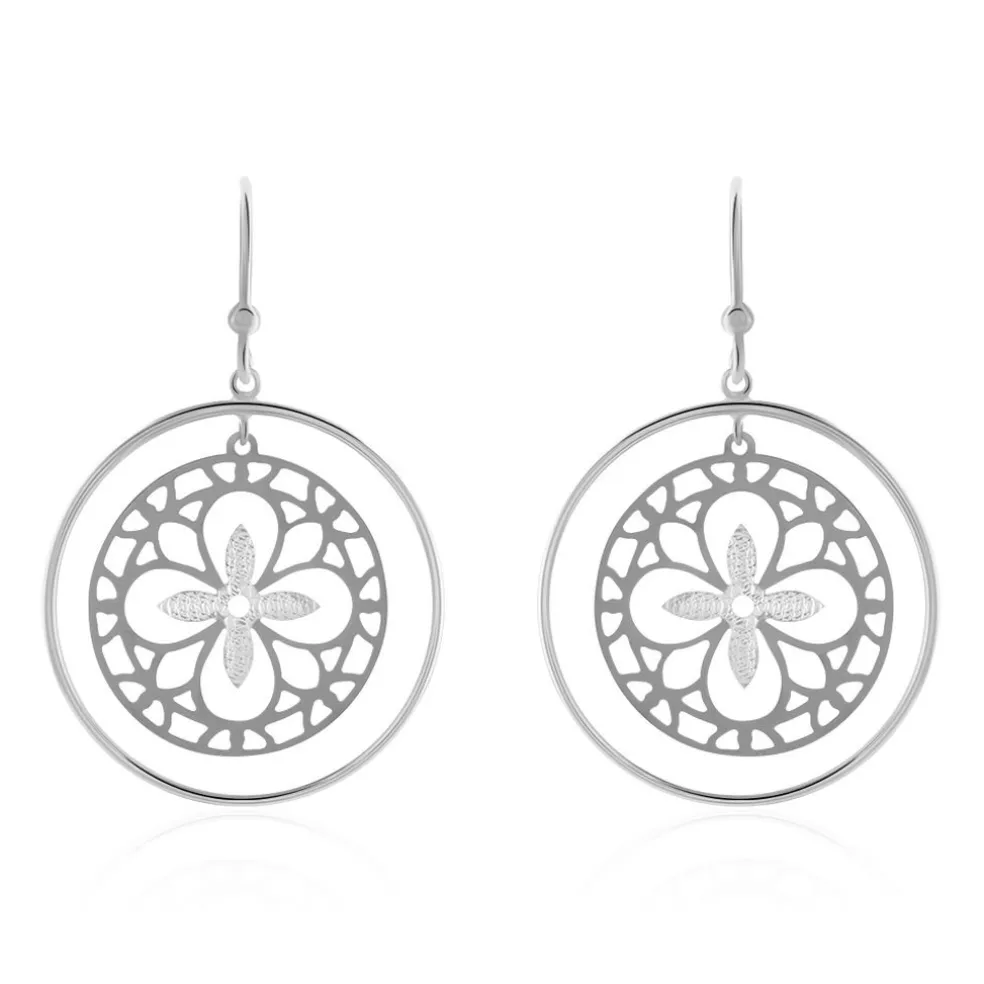 Boucles D’oreilles Pendantes Or Blanc 375/1000 Double Cercles Avec Motif Trefles Ajoures