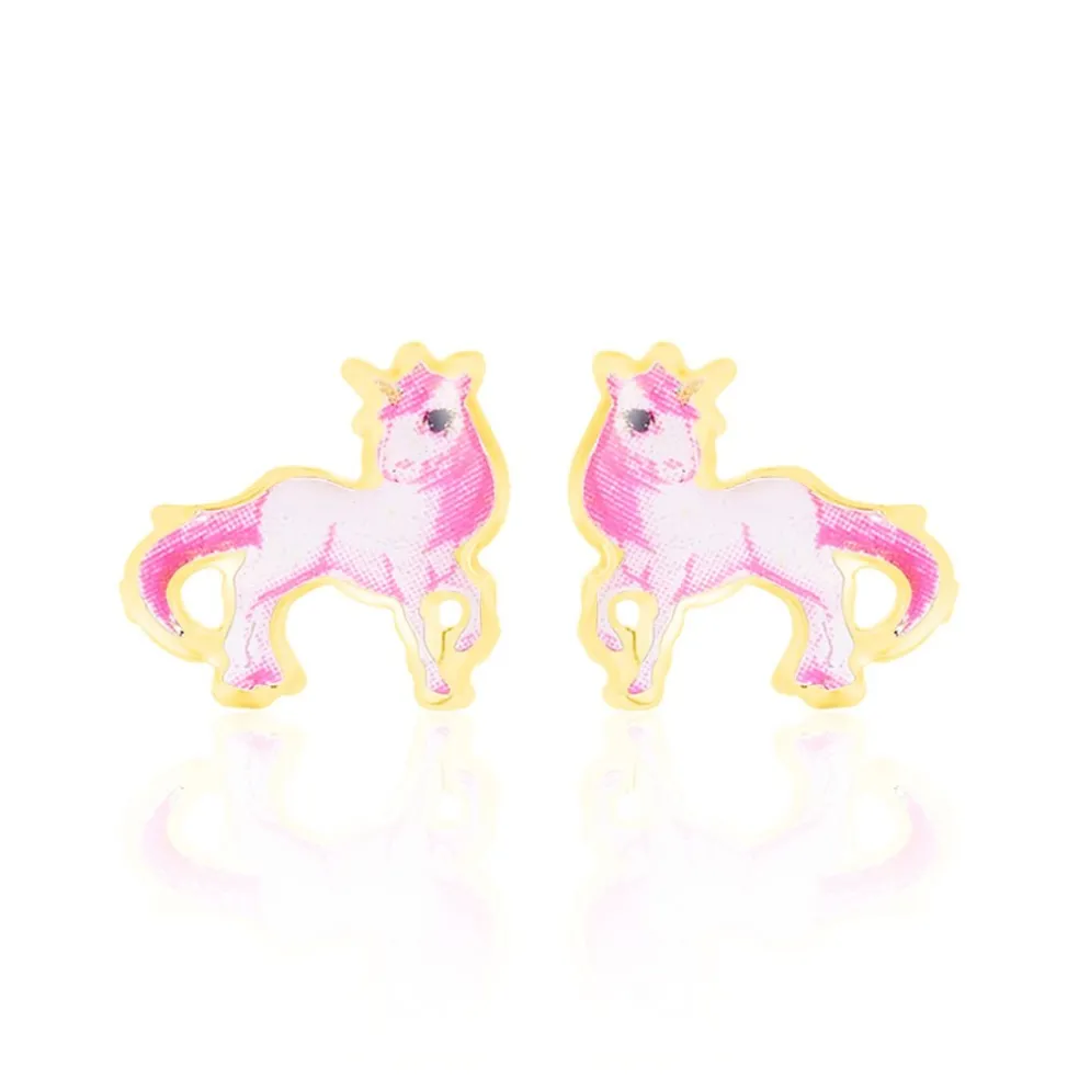 Boucles D’oreilles Or Jaune 375/1000 Puces Motifs Poneys Smalto Rose