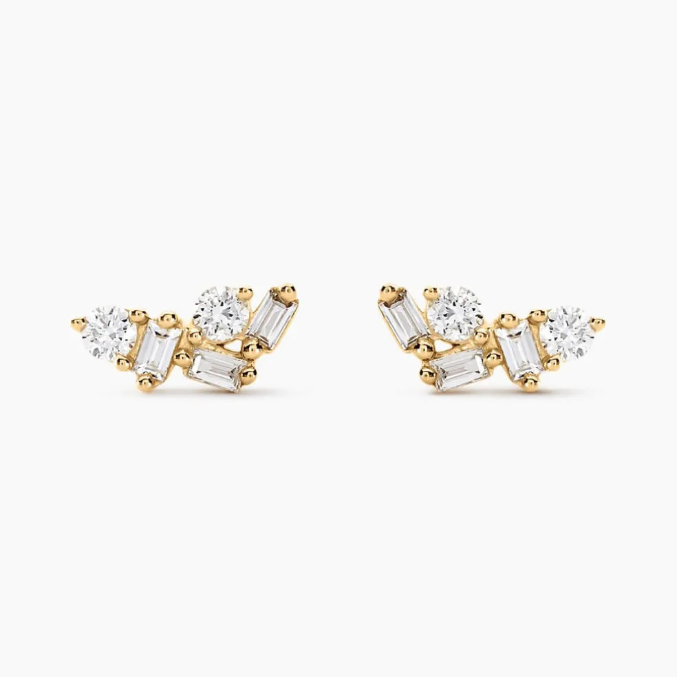 Boucles D’oreilles Puces Or Jaune 375/1000 Jardin De Pierres Diamants Synthetiques Rondes 0.12cts Et Baguettes Sertis Griffes