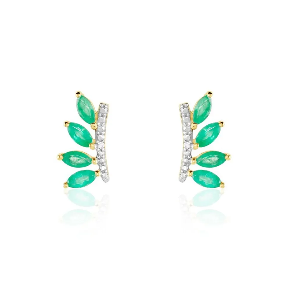 Boucles D’oreilles Puces Or Jaune 375/1000 Petales Emeraude Navette 0.56 Cts Serti Griffes Et Pavage Diamants 0.006 Cts