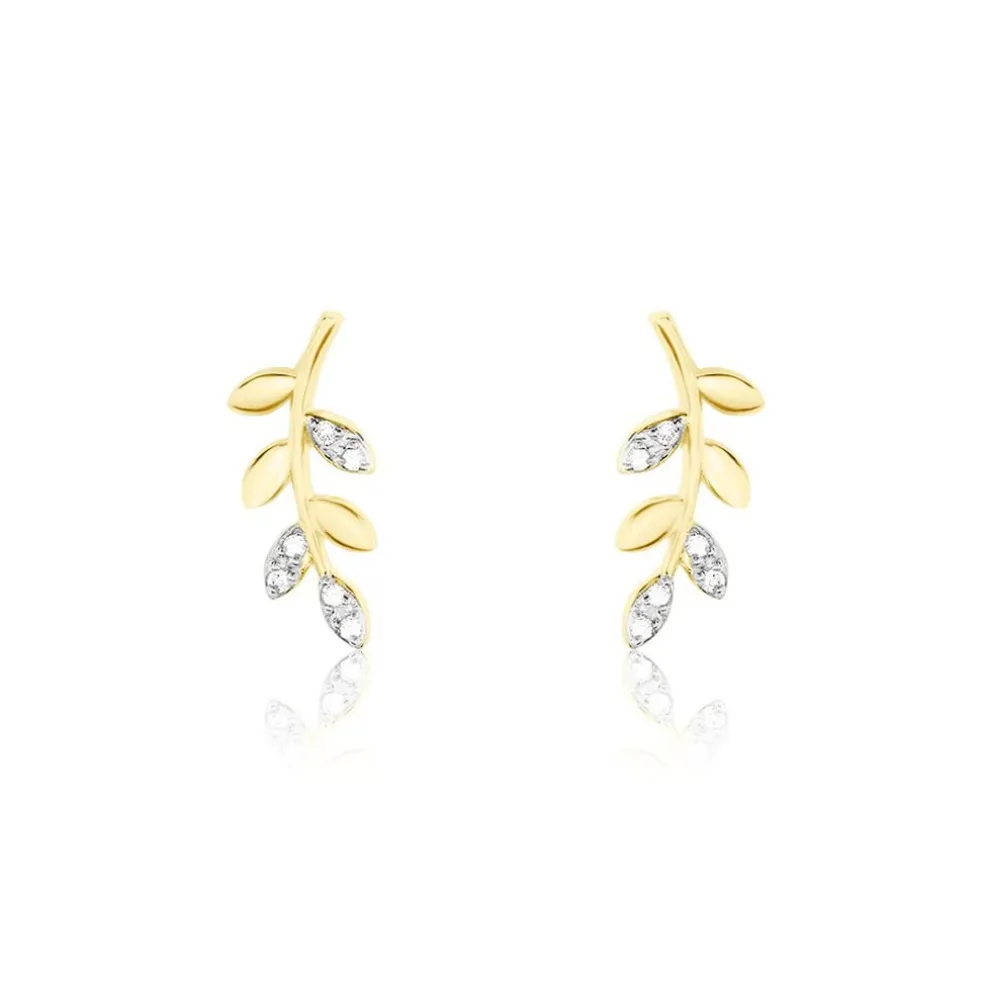 Boucles D’oreilles Puces Or Jaune 375/1000 Feuilles Pavage Diamants Ronds
