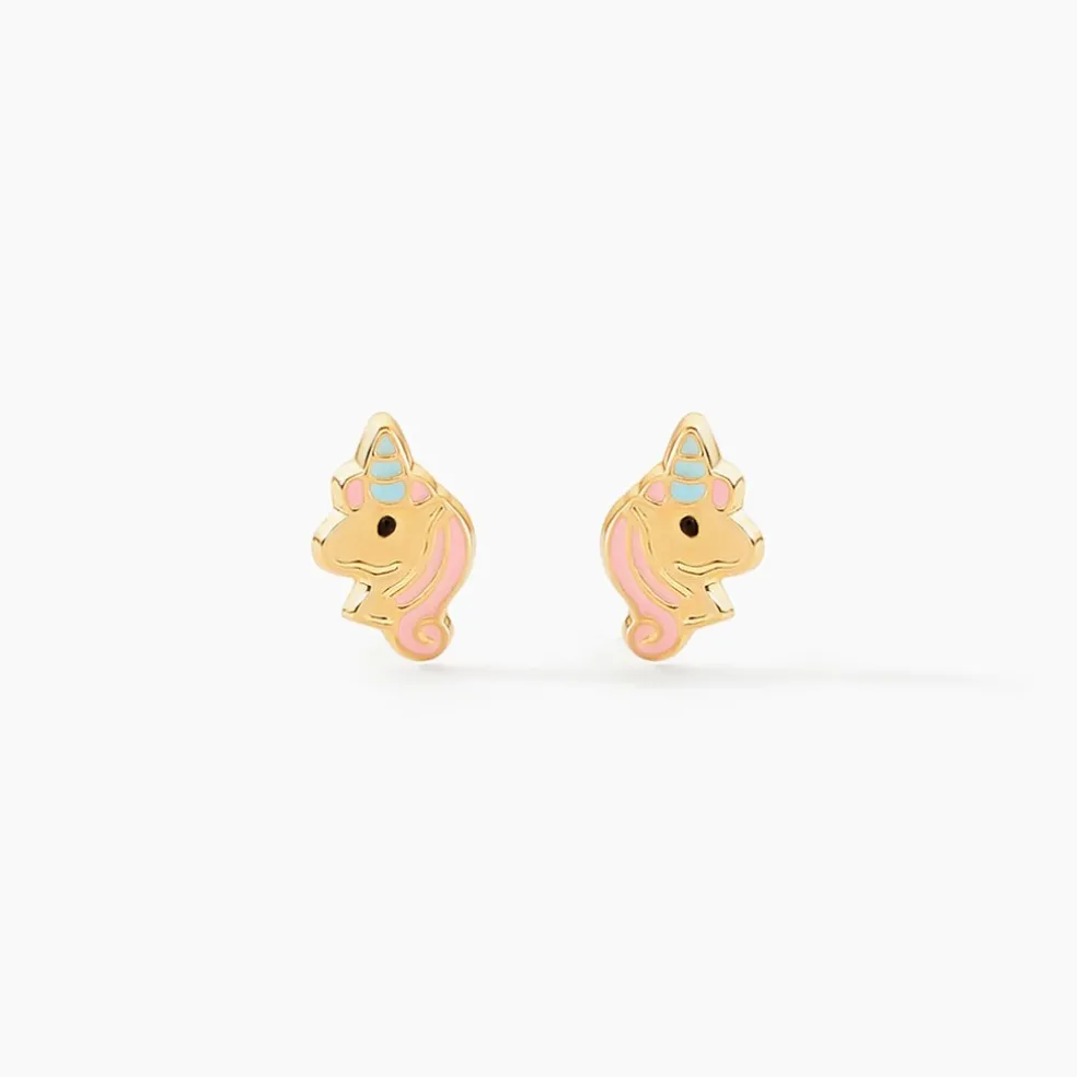 Boucles D’oreilles Puces Or Jaune 750/1000 Licornes Email Multicolore Fermoir A Vis