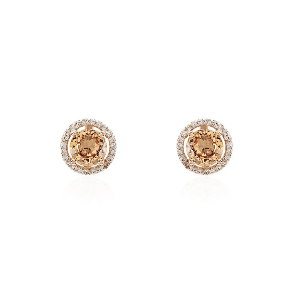 Boucles D’oreilles Puces Argent Rose 925/1000 Oxydes De Zirconium Champagne Entourage Oxydes De Zirconium Sertis Griffes