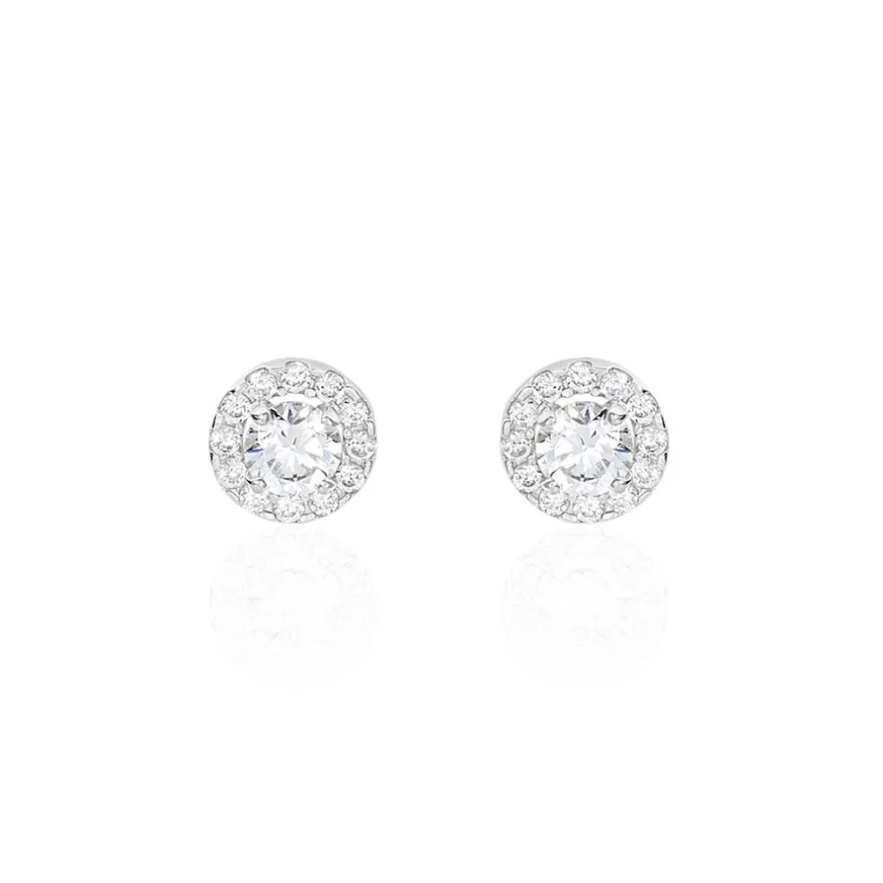 Boucles D’oreilles Or Blanc 375/1000 Puces Entourages Oxydes De Zirconium