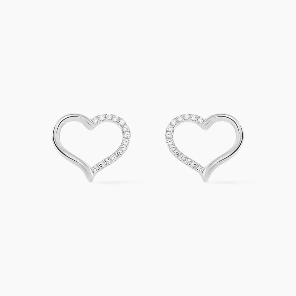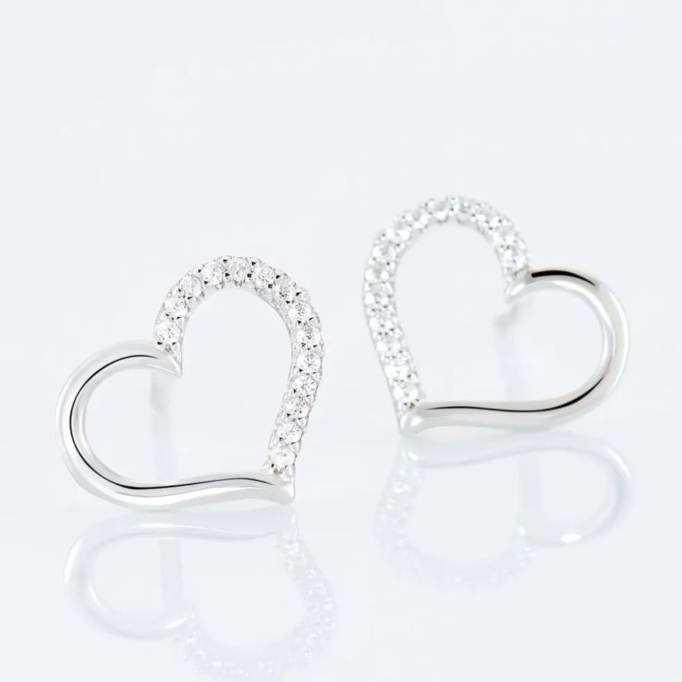 Boucles D’oreilles Puces Argent Blanc 925/1000 Oxydes De Zirconium Forme Coeur 1/2 Cote Pave