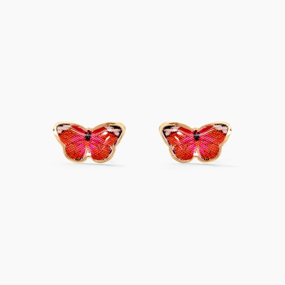 Boucles D’oreilles Or Jaune 375/1000 Puces Papillons Smalto Fushia