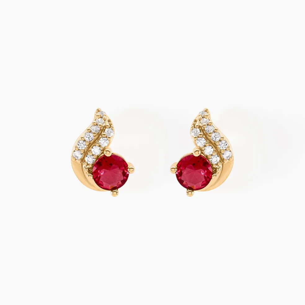 Boucles D’oreilles Puces Plaqué Or Jaune Vagues Pavages Oxydes De Zirconium Pierres Rouges