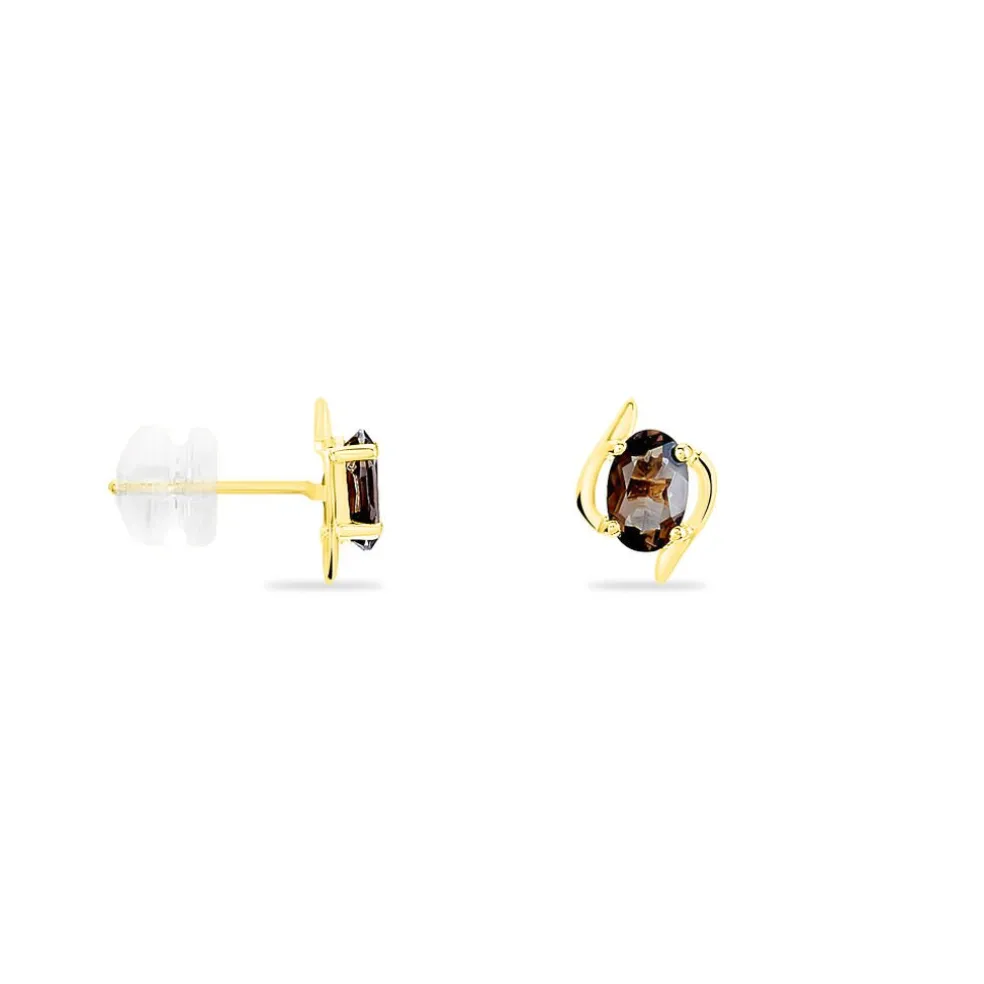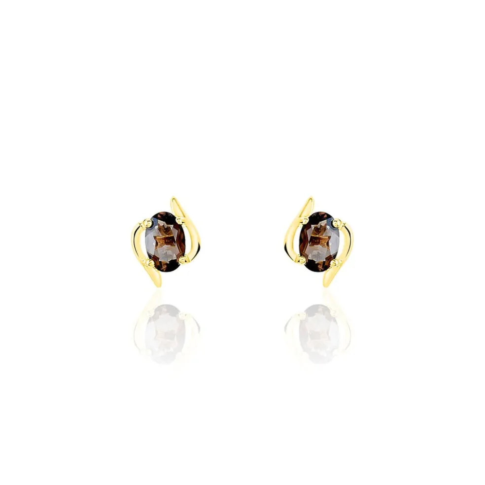 Boucles D’oreilles Or Jaune 375/1000 Quartz Fumes Ovales Serti Griffes