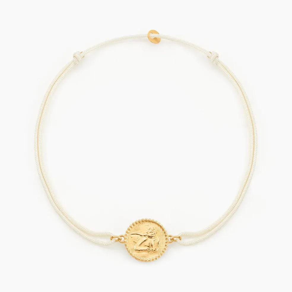 Bracelet Or Jaune 375/1000 Pastille Ange Sable Effet Perle Sur Cordon Nylon Ajustable Creme