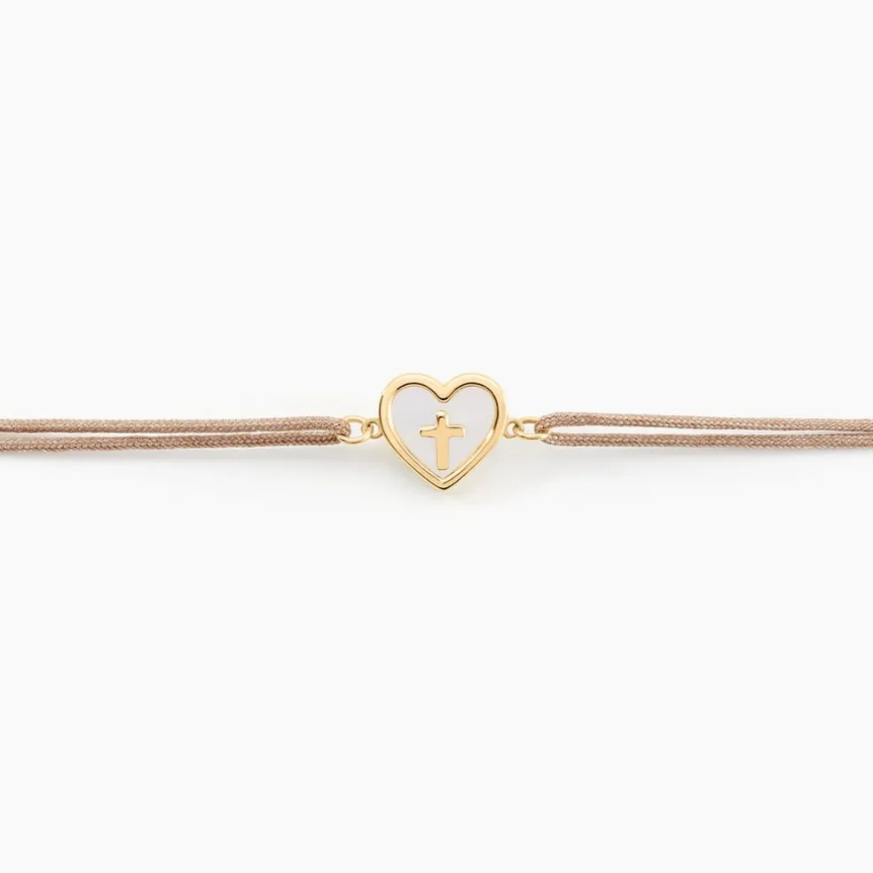 Bracelet Or Jaune 375/1000 C艙ur Et Croix Nacre Blanche Sur Cordon Nylon Ajustable Camel