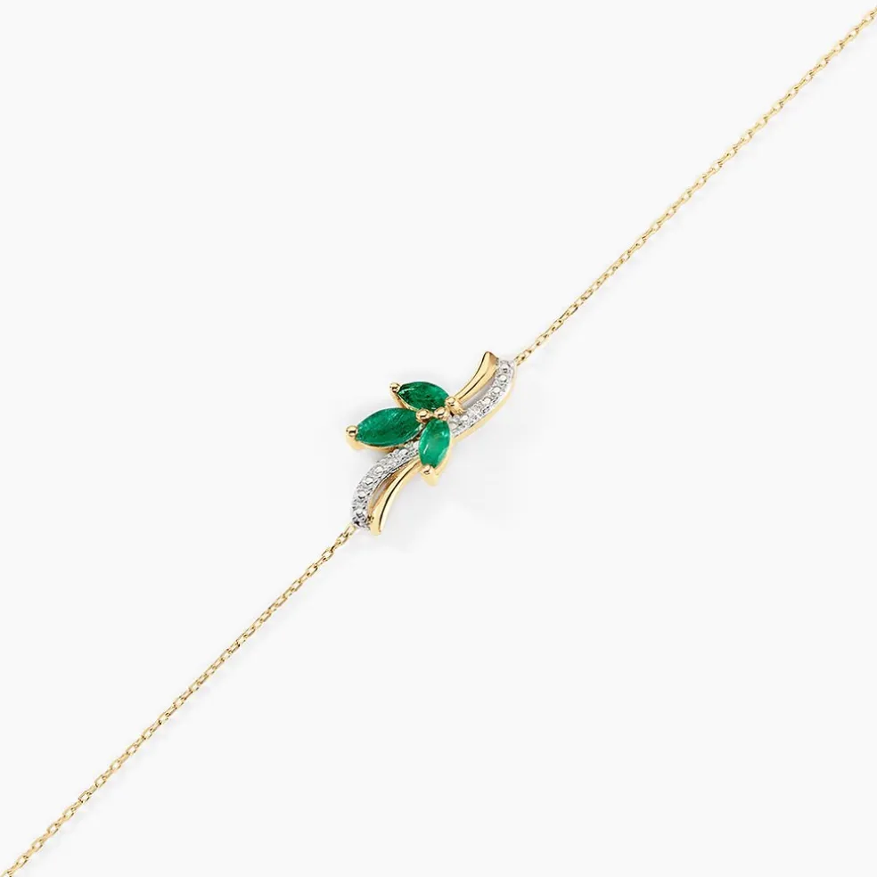 Bracelet Or Jaune 375/1000 Emeraude Forme Navette Et Diamants Blancs Maille Forcat 16+2cm