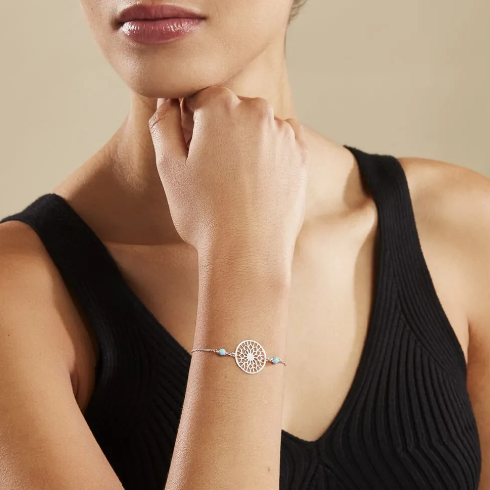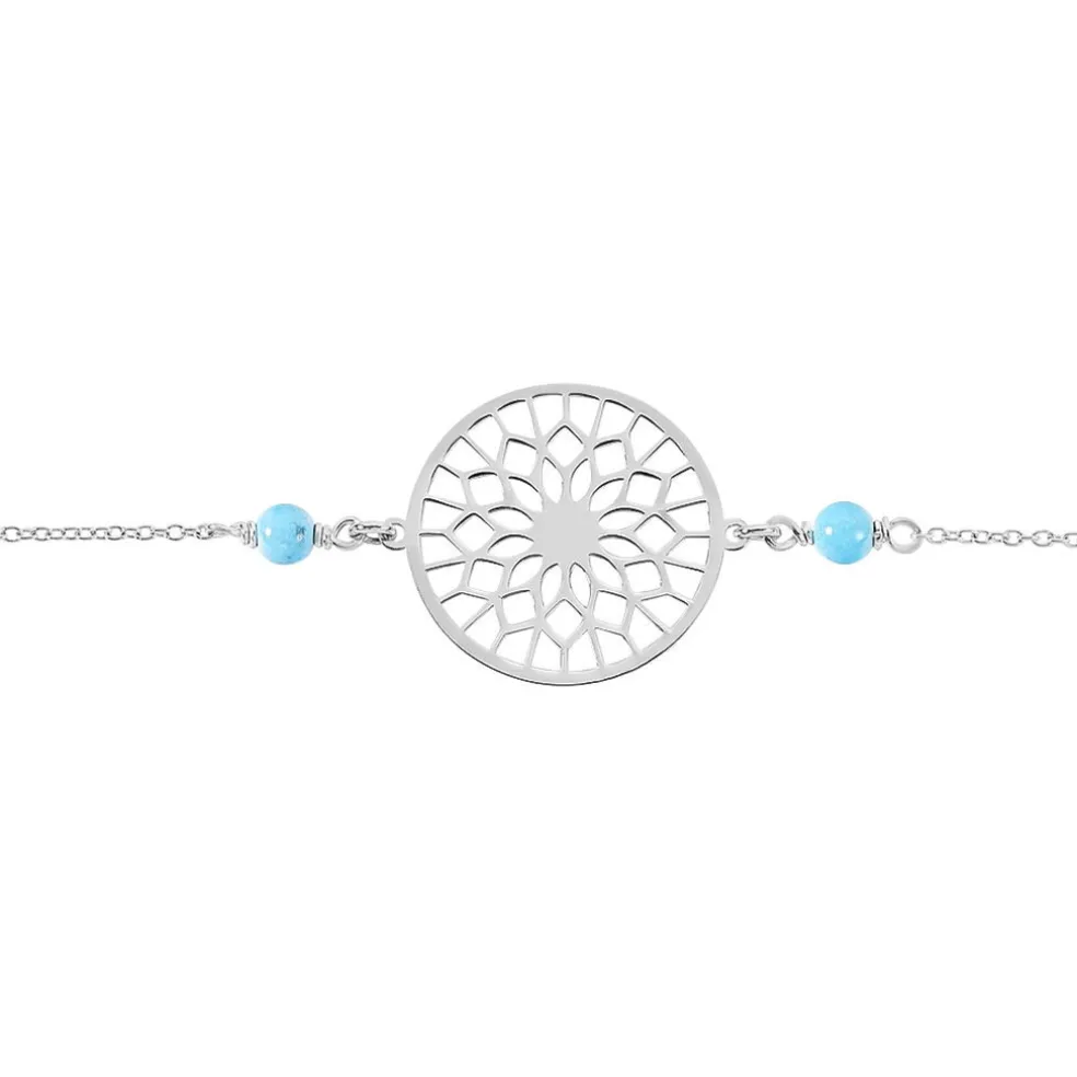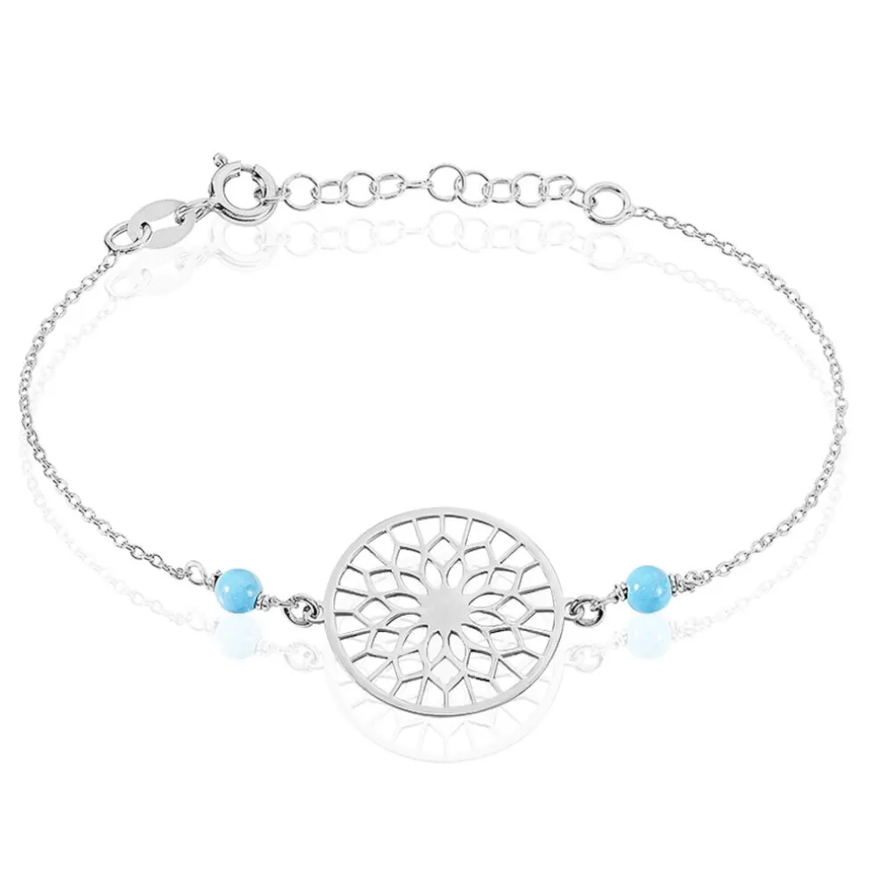 Bracelet Argent Blanc 925/1000 Rosace Resines De Turquoise Bleues Maille Forcat 18.5cm