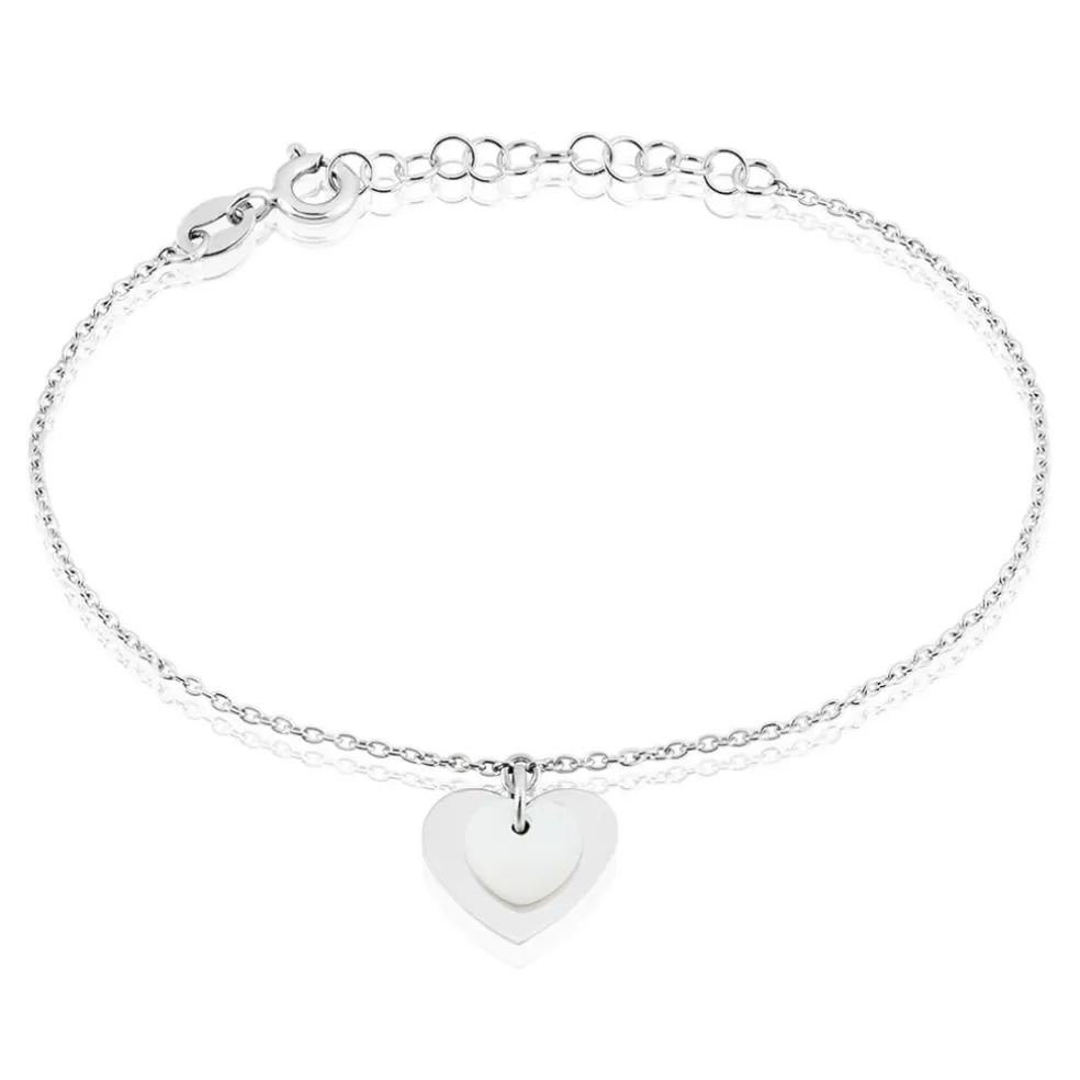 Bracelet Argent Blanc 925/1000 Double C艙urs Nacre Et Argent Blanc Maille Forçat 19cm