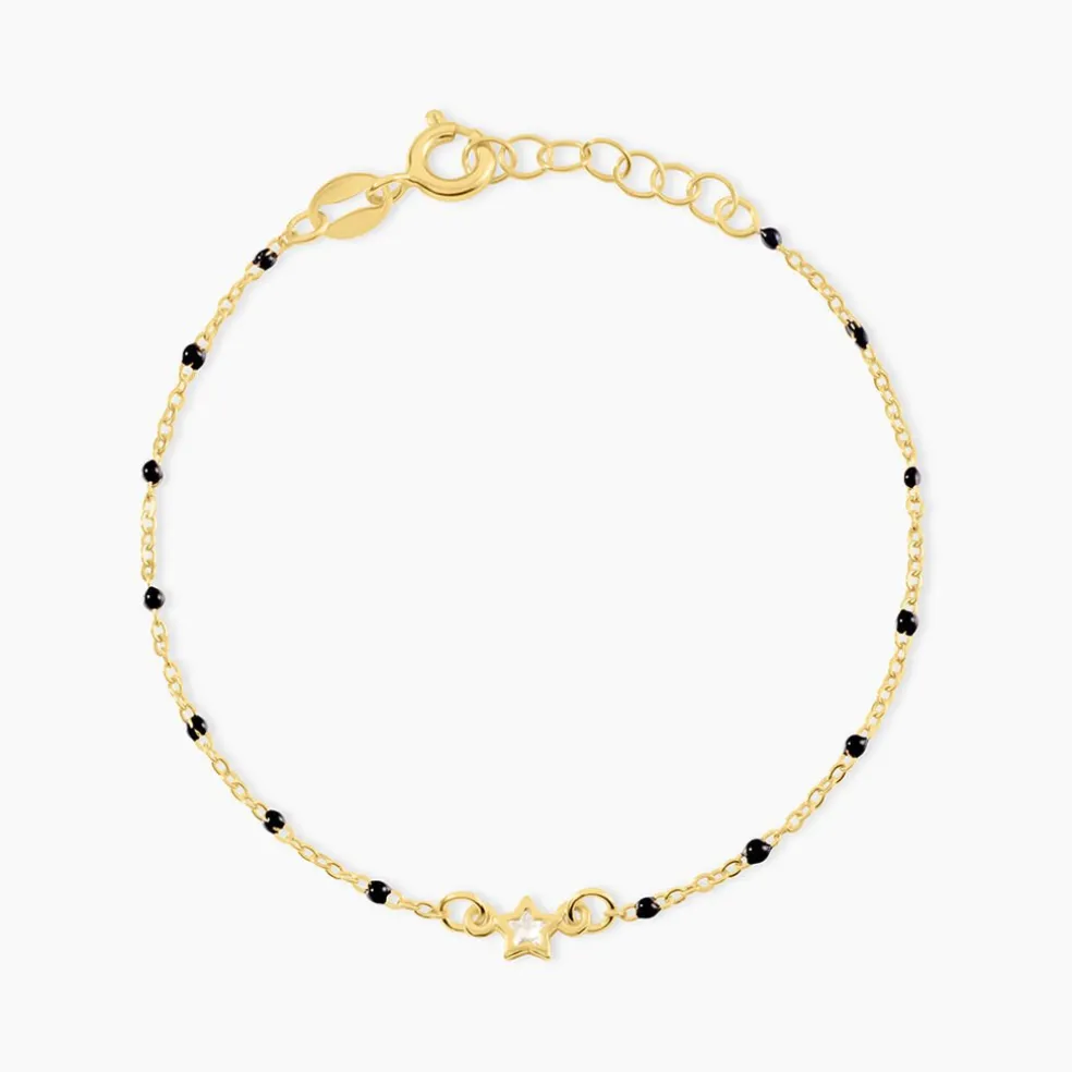 Bracelet Court Argent Jaune 925/1000 Étoile Oxyde De Zirconium Serti Clos Boules Email Noir Maille Forcat 14+2Cm