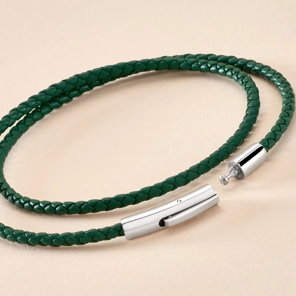 Bracelet Acier Blanc Et Cuir Vert Double Tours 42cm