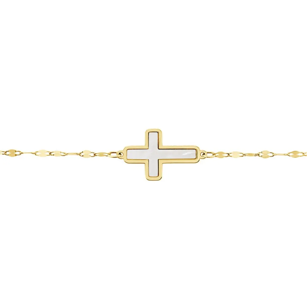 Bracelet Or Jaune 375/1000 Croix Nacre Blanche Maille Lumina 16+2cm