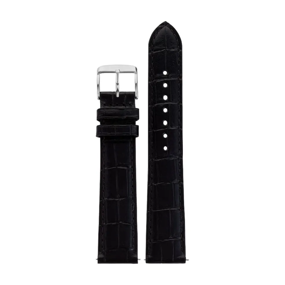 Bracelet De Montre Rochet Cuir De Veau Grain Noir Motif Alligator Boucle Argentée 18/16mm
