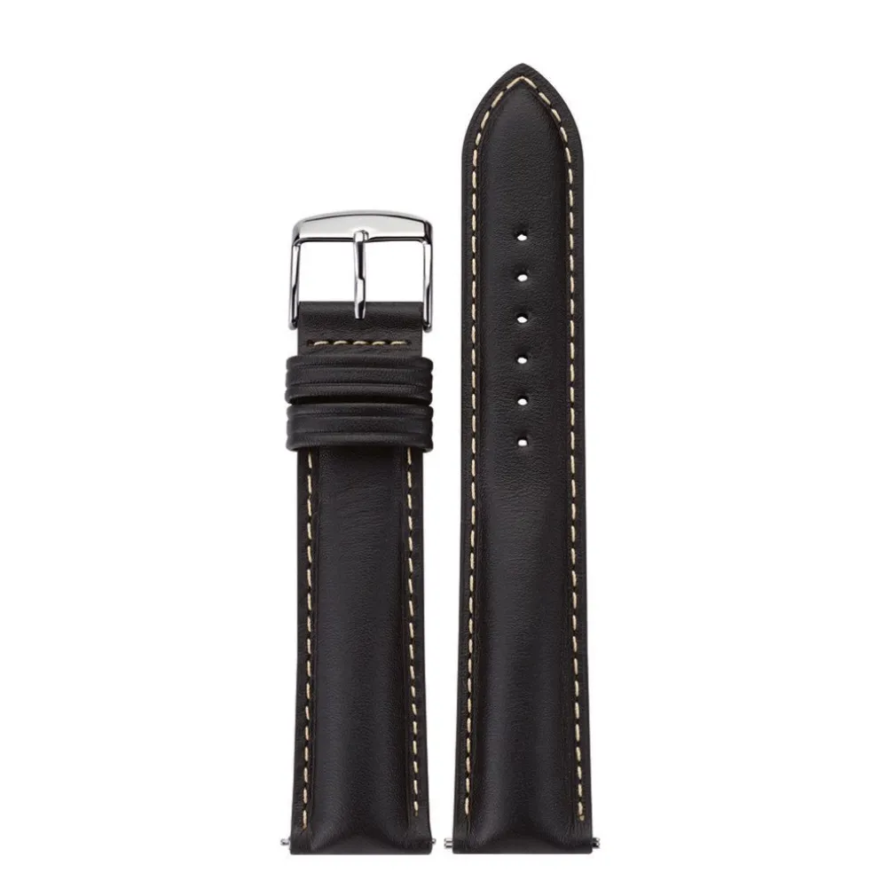 Bracelet De Montre Rochet Cuir De Veau Mat Noir Boucle Argentée 20/18mm