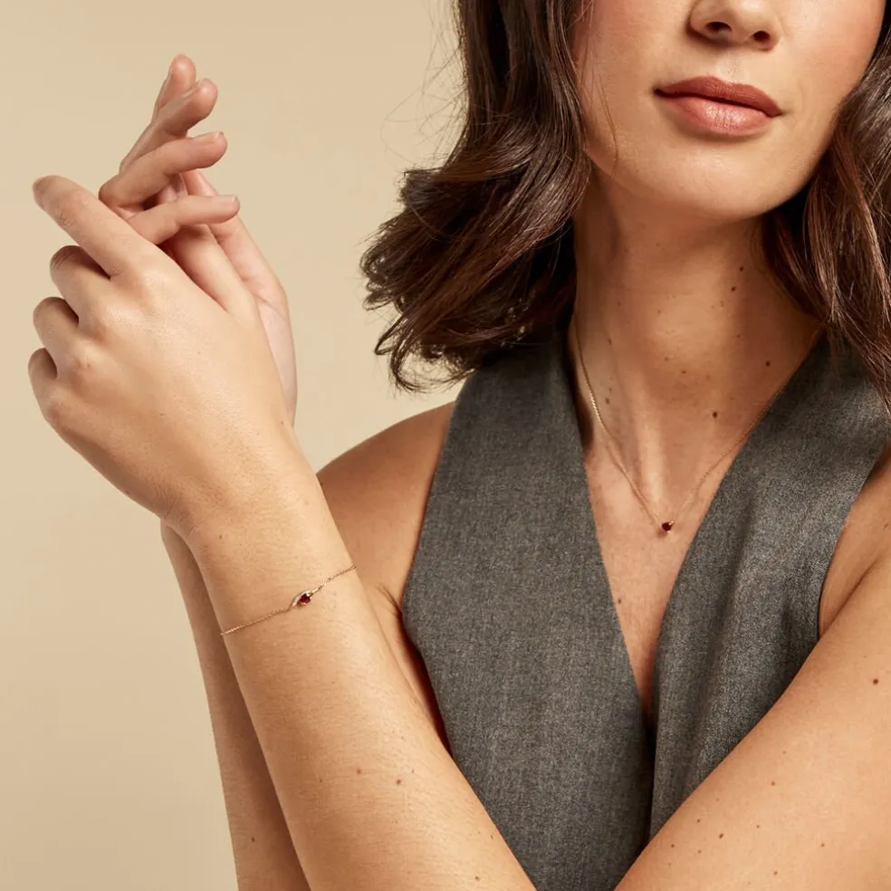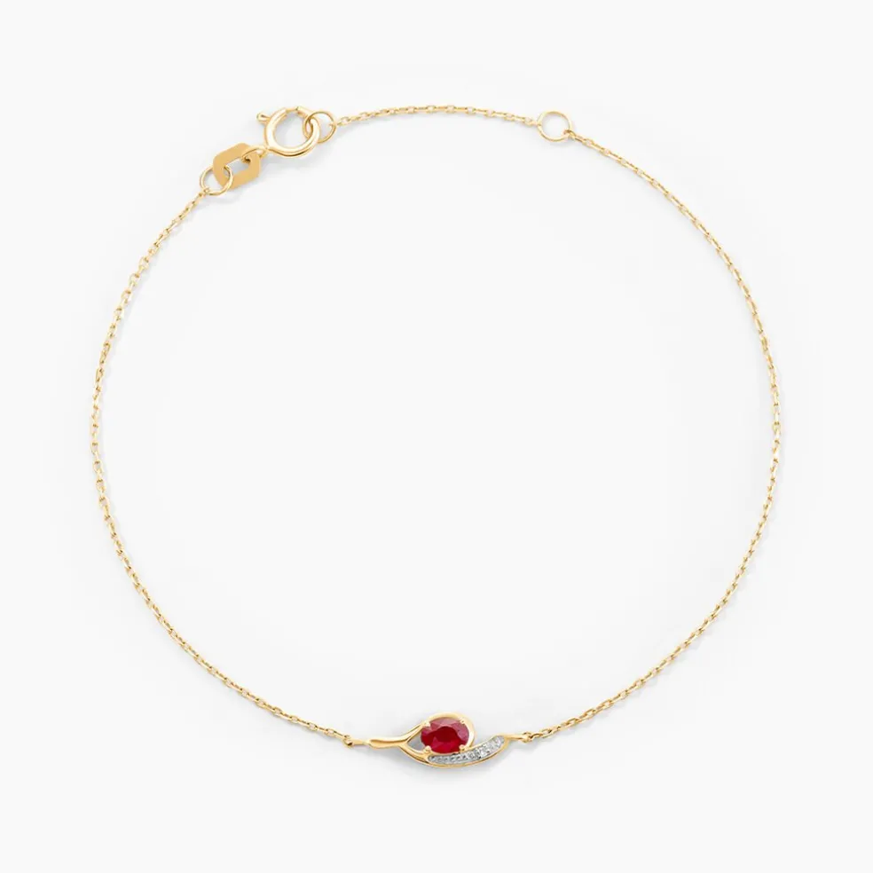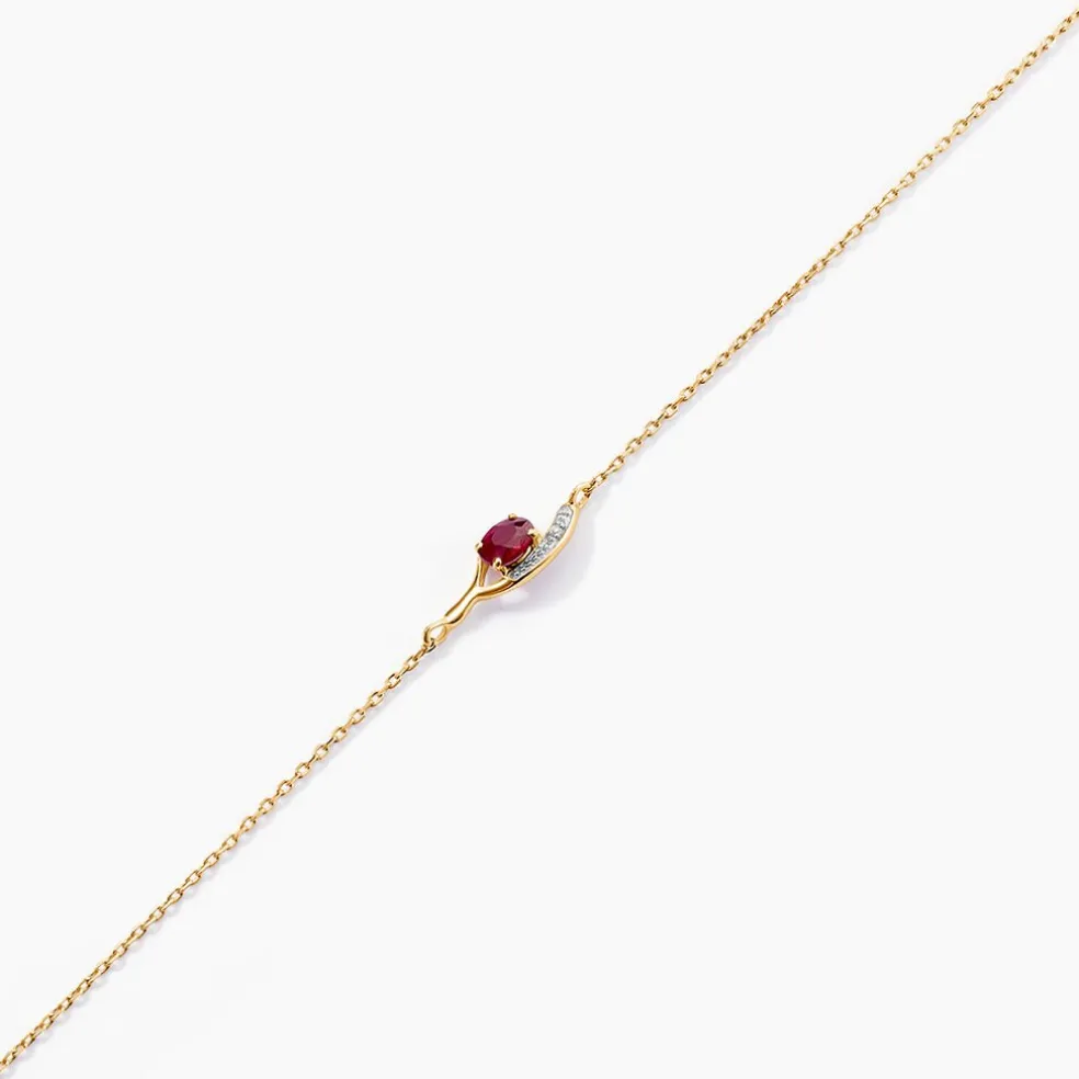 Bracelet Or Jaune 375/1000 Rubis Ovale 0.23cts Et Diamant Sertis Griffes Maille Forcat 16+2cm