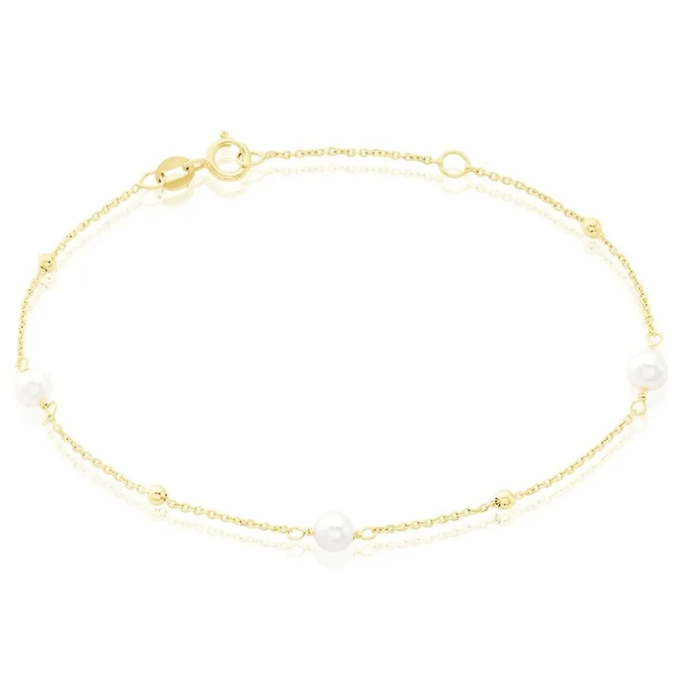 Bracelet Or Jaune 375/1000 3 Perles De Culture Rondes Blanches 3.5/4mm Alternees 4 Boules Lisses Maille Forcat 16+2cm