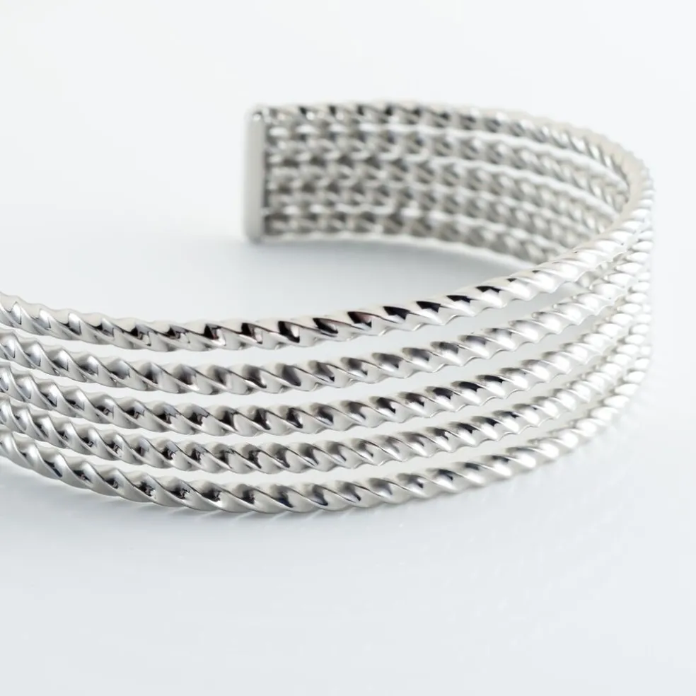Bracelet Jonc Acier Blanc Ouvert Multirangs Tresses Largeur 2.5mm Diametre 60mm