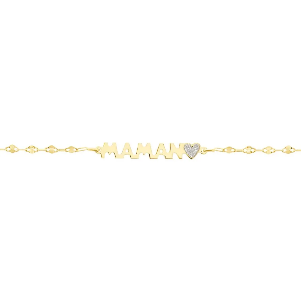 Bracelet Or Jaune 375/1000 Message Maman Lettres Decoupees + Coeur Plein Glitter Argente Maille Lumina 16+2cm