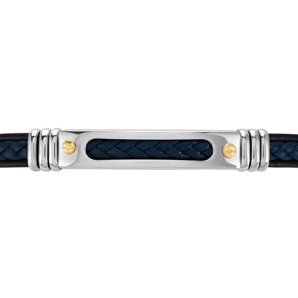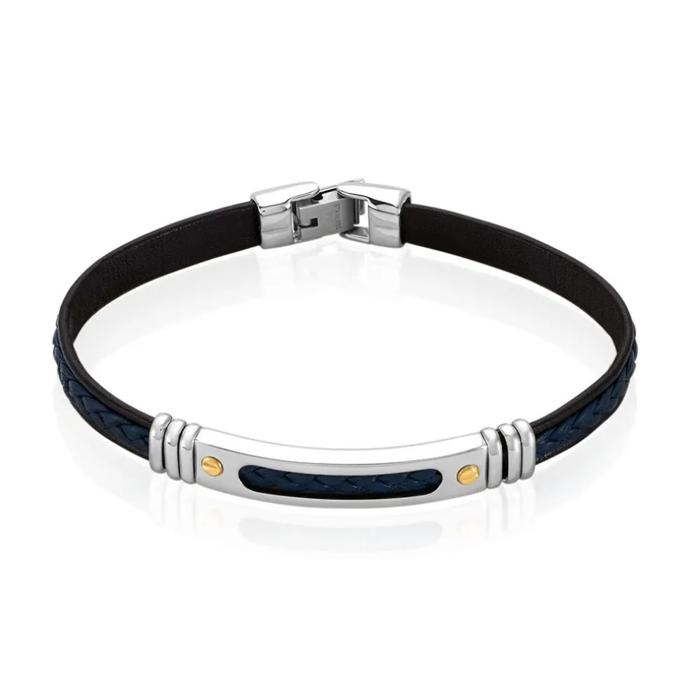Bracelet Jourdan Homme Cuir Bleu Acier Gris Decor Or 21.5cm Jh300011b
