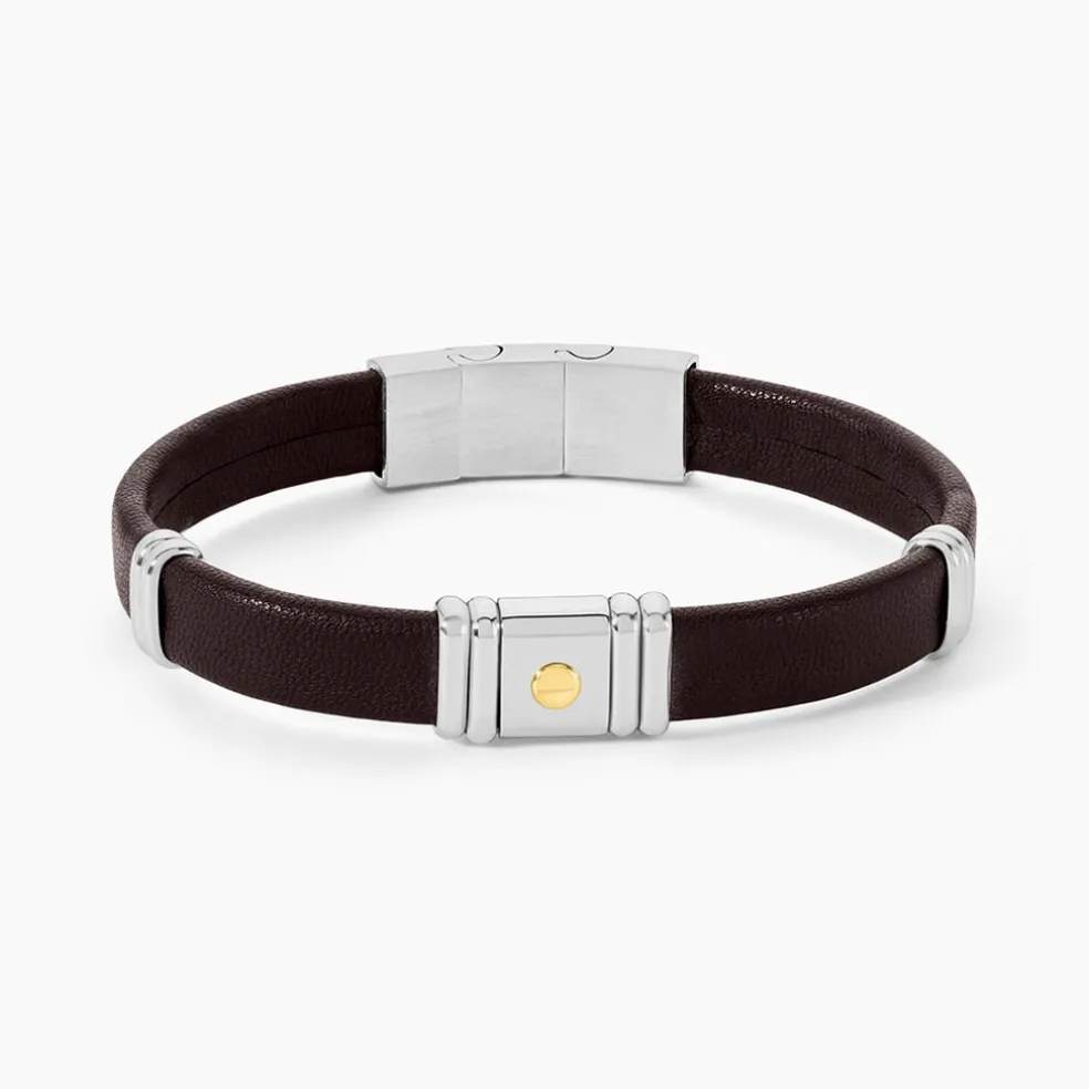 Bracelet Jourdan Homme Cuir Marron Acier Gris Decor Or 21.5cm Jh300007b