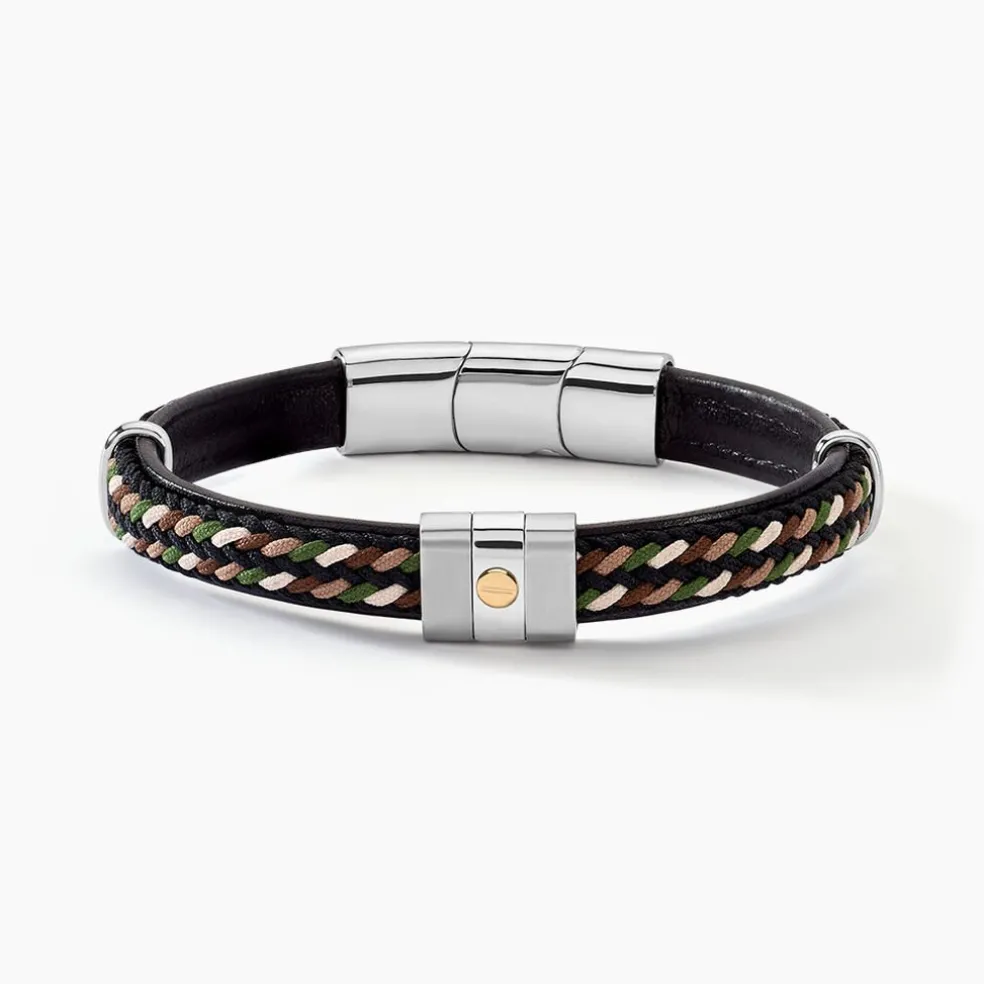 Bracelet Jourdan Homme Cuir Et Polyester Tresse Noir Acier Gris Decor Or 21.5cm Jh300030b