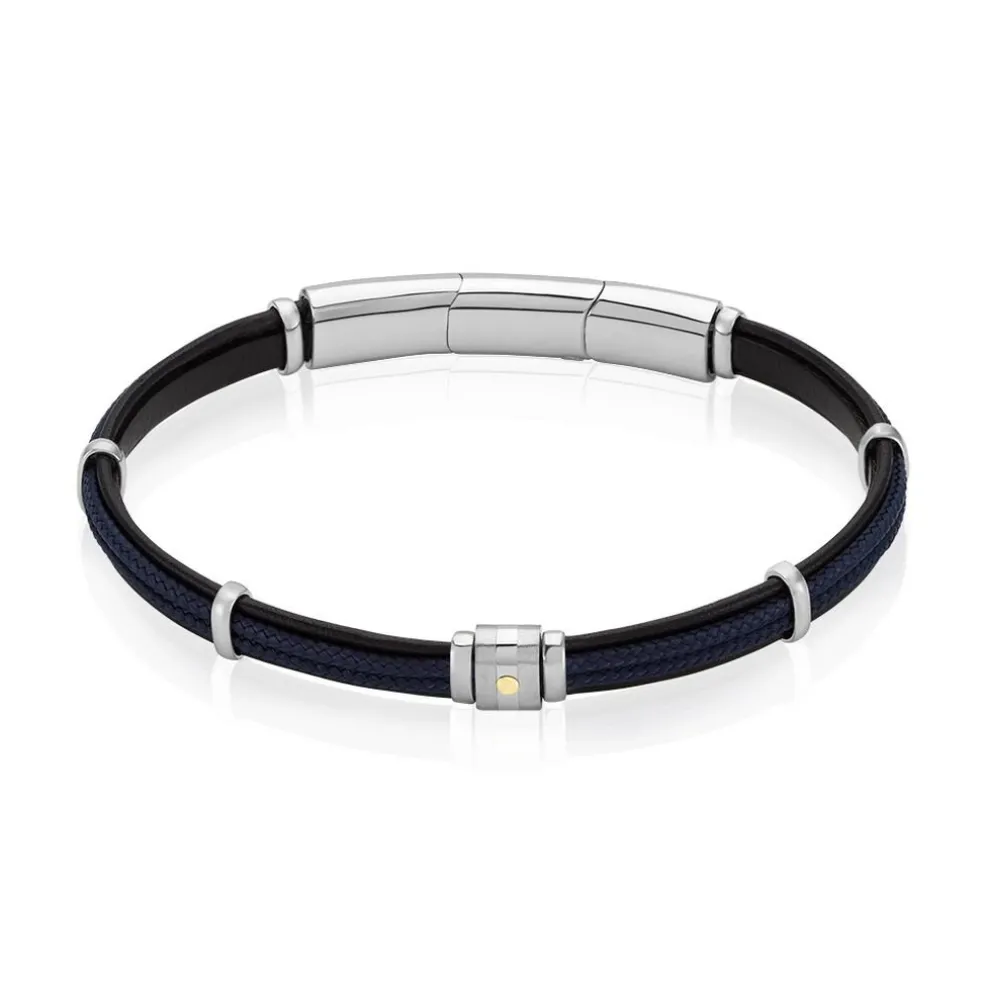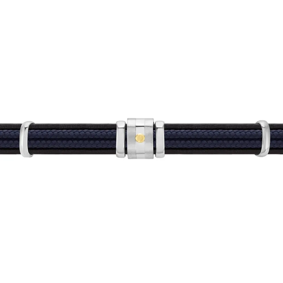 Bracelet Jourdan Homme Cuir Noir Cordelette Bleue Acier Gris Et Decor Or 21.5cm Jh150144b