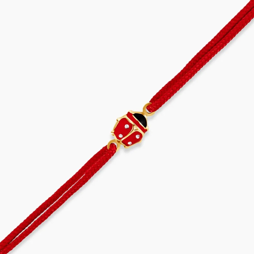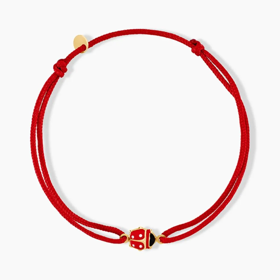 Bracelet Or Jaune 375/1000 Coccinelle Email Rouge Avec Oxyde De Zirconium Cordon Coton Rouge Ajustable