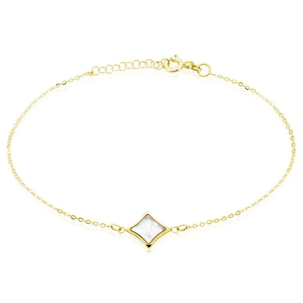 Bracelet Or Jaune 375/1000 Losange Nacre Blanche Serti Clos Maille Forcat 16+2cm