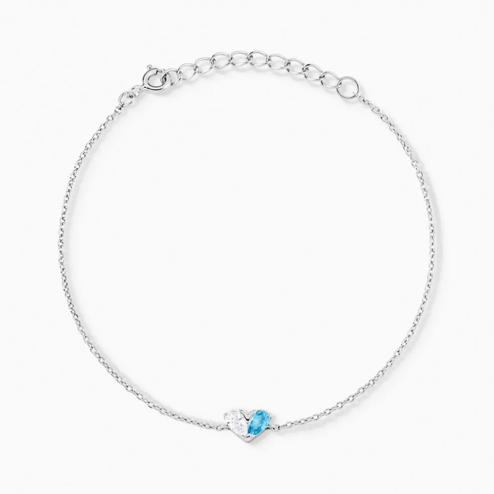Bracelet Argent Blanc 925/1000 C艙ur Oxydes De Zirconium Bleu Et Blanc Maille Jaseron 16+3cm
