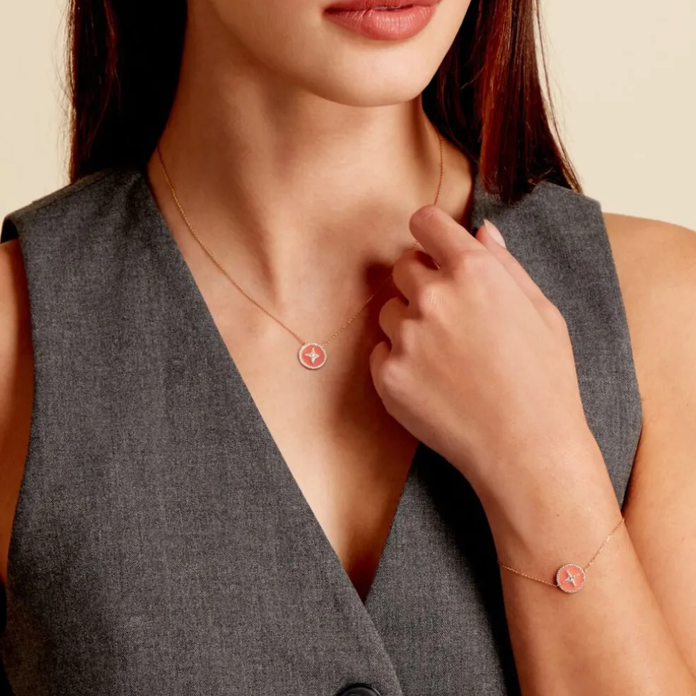 Bracelet Or Jaune 375/1000 pastille Email Corail Etoile Du Berger Pavage Oxyde Zirconium Chaine Maille Forcat 16+2cm