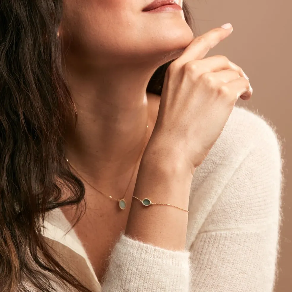 Bracelet Or Jaune 375/1000 Amazonite Ovale Contour Effet Perle Maille Jaseron 16+2cm